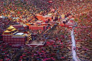 【色达佛学院】--是世界上最大的藏传佛学院之一。在佛学院最高的山峰上,有一个金碧辉煌的建筑,叫做“坛城”,这里的僧舍壮观,连绵数公里的山谷布满了密密麻麻的小木棚屋。谷底和山梁上分布着几座寺庙和佛堂,建筑规模不大,但装饰考究、辉煌;身披桨红色僧袍的喇嘛和尼姑来来往往,空气中充满生机和祥和气氛,令人赞叹,是摄影创作的胜地。