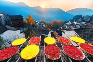挂在山崖上的篁岭古村,地无三尺平,数百年来,村民早已习惯用平和的心态与崎岖的地形“交流”。自然条件的局限却激发了先民的想象和创造力,从而在无意间造就了一处中国绝无仅有的“晒秋人家”风情画。篁岭古村数百栋徽派古民居在百米落差的坡面错落有序排布,每当日出山头,晨曦映照,整个山间村落饱经沧桑的徽式民居土砖外墙与晒架上、圆圆晒匾里五彩缤纷丰收果实组合,绘就出世界独一无二的“晒秋”农俗景观、最美的乡村符号。