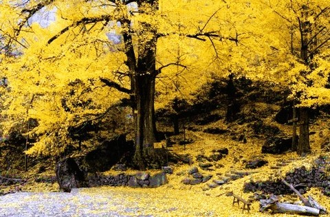 11月的水没坪,古老的银杏树,叶子散落在村道,田间,溪流,房舍。
