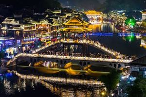 凤凰古城又被称为艳遇之都,因为这里的夜让人心醉,灯火璀璨,穿过影绰人群,随便寻一处临水而设的茶肆酒吧,或漫步虹桥风雨楼,或钻进岸边吊脚楼苗家人餐馆,一人独饮发呆或亲朋偕欢,找寻失迷的自己。