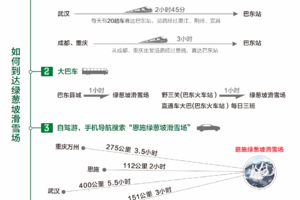 动车:动车直达,平均每天有20趟火车从武汉到巴东站,下火车后约1小时车程直抵滑雪场。