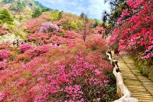 依次游玩花宇山花海两大核心景点,漫步花径木栈道,置身在花的海洋中,赏漫山杜鹃花红。