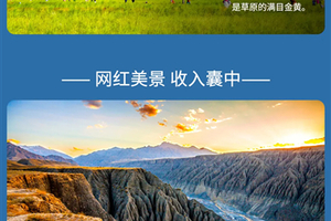 今日前往乌市,途中游览独山子大峡谷,在独山子境内奎屯河流经独山子大峡谷之中,峡谷呈南北走向,峡谷两边悬崖陡峭,谷底流水时分时合,谷肩地面是荒漠草原,站在谷肩处遥望峡谷,呈现在眼前的是一幅壮丽的大峡谷景象,令人惊叹不已。游览结束后,乘车返回乌市散团(乌市机场及火车站),旅行至此告一段落。新疆是个好地方,欢迎您下次再来!