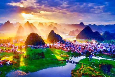 这里既有桂林山水孤峰、清流、幽洞、奇石的灵秀,又有江南水乡小桥、流水、人家的古朴神韵,还有杭州西湖波光潋滟的明丽。“水上田园、游船泛舟、洞穴穿越、草场放牧、暗河探险、湖泊峰林、彝家水乡、岩溶穴葬、荷花世界、候鸟天堂、油田奇观”而著称的普者黑,幽静秀丽的高原湖泊群,苍翠叠嶂的孤峰群,鬼斧神工的溶洞群及险恶的峡谷,壮观的瀑布,仙境般的云海,罕见的古代文化遗址、绚丽多彩的民族风情巧妙融为一体的风景名胜区。